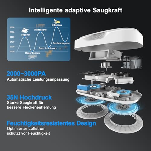 💨【Intelligente Saugkraftanpassung, automatische Schmutzerkennung】fensterputzroboter kann den Verschmutzungsgrad auf Glas erkennen und die Saugkraft automatisch entsprechend der Verschmutzungsmenge anpassen. Bei hartnäckigen Flecken erhöht er die Saugkraft, um eine gründliche Reinigung zu gewährleisten; bei leichteren Flecken reinigt er sanft, um die Oberfläche zu schützen.