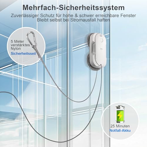 🛡️【Mehrfacher Sicherheitsschutz und USV】 Der fensterreiniger elektrisch wird über ein Stromkabel mit Strom versorgt und ist mit einer Sicherheitsleine ausgestattet, die sicherstellt, dass das Gerät auch bei einem versehentlichen Herunterfallen nicht zu Boden fällt. Darüber hinaus bietet die integrierte unterbrechungsfreie Stromversorgung zusätzlichen Schutz bei Stromausfällen.