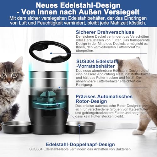 【LEBENSMITTELAUFBEWAHRUNG AUS EDELSTAHL】Der edelstahlspeicherbehälter bewahrt futter besser auf als silikon, hält es trocken und frisch und verhindert schimmel und feuchtigkeit. Der futterspender verwendet futternäpfe aus lebensmittelechtem 304-edelstahl, um allergische Reaktionen auf Kunststoff zu verhindern, leicht zu reinigen und halten jede Mahlzeit frisch und sicher. Das Rotordesign verhindert, dass Futter stecken bleibt, und eignet sich für Trockenfutter und Pellets kleiner als 18 mm.