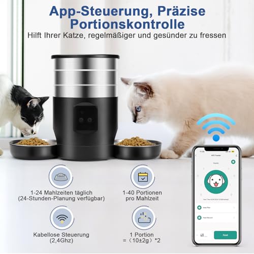 5L Automatischer Futterautomat Katze 2 Näpfe, Katzenfutter Automat 2.4G WiFi Edelstahl Anti-Clog 24h Timer 1-10 Mahlzeiten Tag 1-40 Portionen, Futterspender Trockenfutterspender für Hunde Katzen