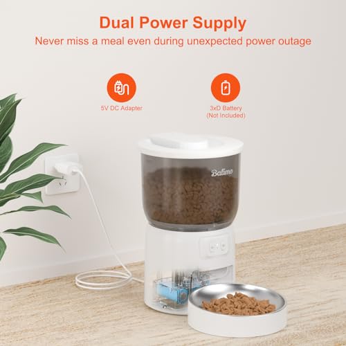 【Doppelter Stromversorgungsmodus】Sie können den Katzenfutterspender mit dem mitgelieferten Netzteil oder 3 Batterien der Größe D (nicht im Lieferumfang enthalten) mit Strom versorgen. Es wird empfohlen, die Batterien einzulegen, während Sie das Netzkabel anschließen, damit Sie Ihr Haustier auch bei Stromausfall mit dem Futterspender versorgen können. Es ist nicht notwendig, das Gerät nach dem Einschalten zurückzusetzen und es wird weiterhin funktionieren.
