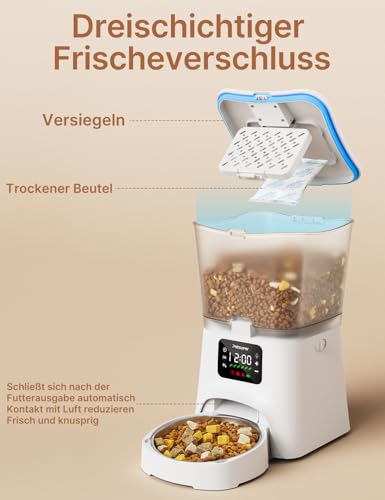 Futterautomat Katze,3L Katzenfutter Automat mit Programmierbarem Timer 1-6 Mahlzeiten pro Tag-Futterspender Hund mit Pressedeckel und 10s Aufnahmefunktion