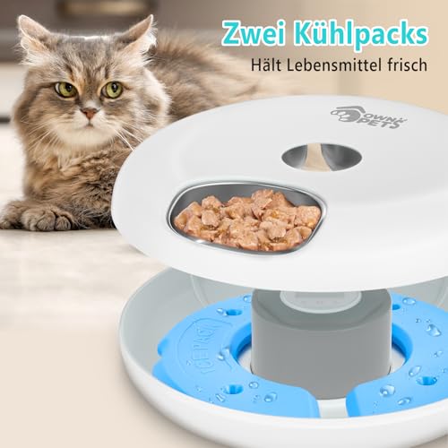 Ownpets Automatischer Katzenfutterautomat für Nass/Trockenfutter, Futterspender für Haustiere, mit Edelstahl-Schüssel-Einsätzen, 6 Mahlzeiten mit 2 Kühlakkus, schützen Pfoten Design, Weiß