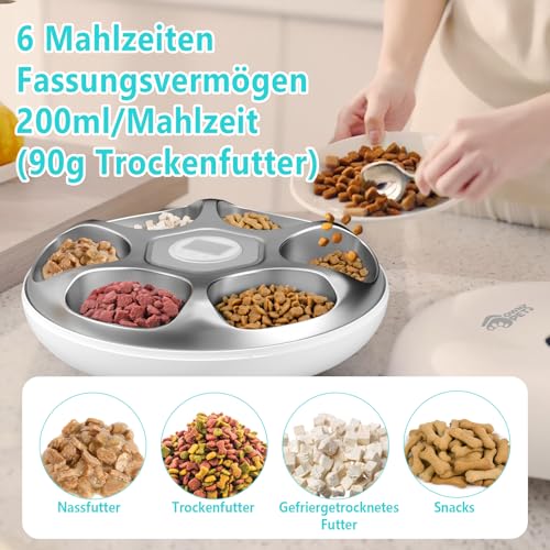 Futterautomat Katze Nassfutter : Automatische Katzenfutterspender verfügt über 6 einzelne Futterkammern. Jede Portion fasst 8 Unzen Futter. Dadurch wird sichergestellt, dass der Nährstoffbedarf Ihres Haustieres gedeckt wird und gleichzeitig eine gesunde Fütterungsroutine beibehalten wird.