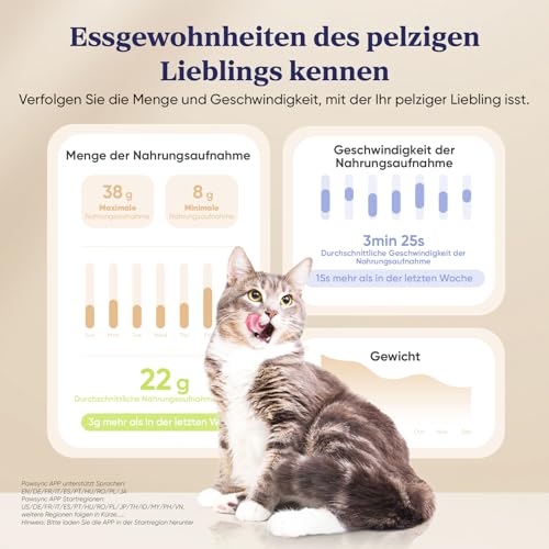 𝑰𝒏𝒕𝒆𝒍𝒍𝒊𝒈𝒆𝒏𝒕𝒆 𝑾𝒂𝒂𝒈𝒆 𝒗𝒆𝒓𝒇𝒐𝒍𝒈𝒕 𝒋𝒆𝒅𝒆𝒏 𝑩𝒊𝒔𝒔𝒆𝒏: Die eingebaute Waage des Futterautomaten überwacht die Fressgewohnheiten Ihres Haustiers in Echtzeit und synchronisiert die Daten mit der App, genau bis auf Unze/Gramm; Sie erhalten sofortige Benachrichtigungen zu Fütterungszeiten und -mengen