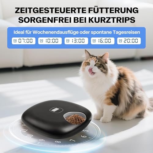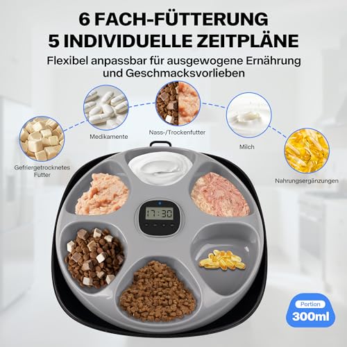 **Nassfutterautomat für Katzen mit 6 Portionsschalen à 300 ml** – Automatische Fütterung zu festen Zeiten, ideal für Nass- und Trockenfutter. Intuitive Steuerung für präzise Fütterungszeiten. Ideal für Katzen und Hunde mit speziellem Ernährungsplan.