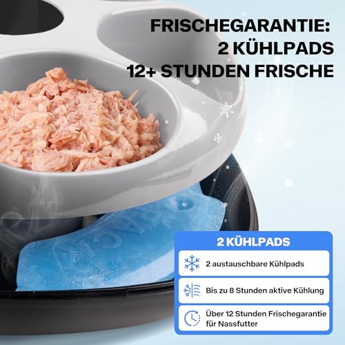 **Frisches Nassfutter rund um die Uhr** – Zwei austauschbare Kühlpads sichern die Qualität. Kein Verderben selbst bei Sommerhitze.