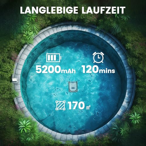 [ Langlebige Akkulaufzeit und schnelle Aufladung ] Der Pool Roboter hat eine Reinigungslaufzeit von bis zu 120 Minuten und kann in nur 2,5 Stunden aufgeladen werden. Der Poolroboter Boden und Wänd ist für alle Formen von Pools geeignet, ob eingelassene oder oberirdisch, bis zu einer Größe von 170 ㎡.