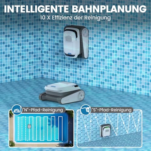 [ Intelligente Navigation, 3 Reinigungsmodi ] Dieser automatische Poolreiniger nutzt intelligente Navigation, um Ihren Pool in einem präzisen, zickzackförmigen Muster zu reinigen und eine vollständige Abdeckung zu gewährleisten. Wählen Sie zwischen der Automatik-Modus für die umfassende Poolreinigung, dem Nur Bodenmodus für den Poolboden oder dem Nur Wandmodus, um sich auf vertikale Flächen zu konzentrieren.