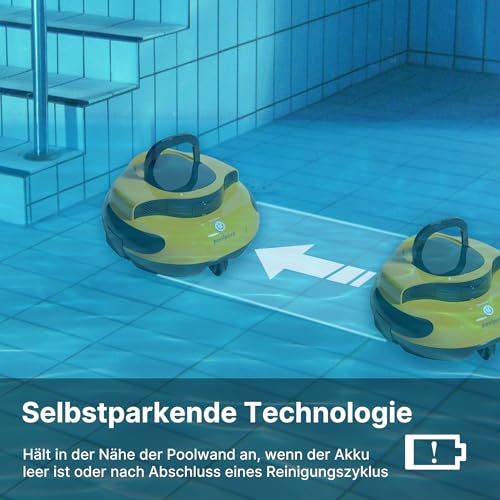 SELBSTPARKFUNKTION: Poolsauger akku mit eingebauter Selbstparktechnologie parkt der Roboterpoolreiniger in der Nähe der Poolwand, wenn der Batteriestand unter 5 % fällt oder nach Abschluss eines Reinigungsvorgangs, um ihn leicht zu entnehmen. Verwenden Sie einfach den mitgelieferten Haken, um ihn aus dem Wasser zu heben.