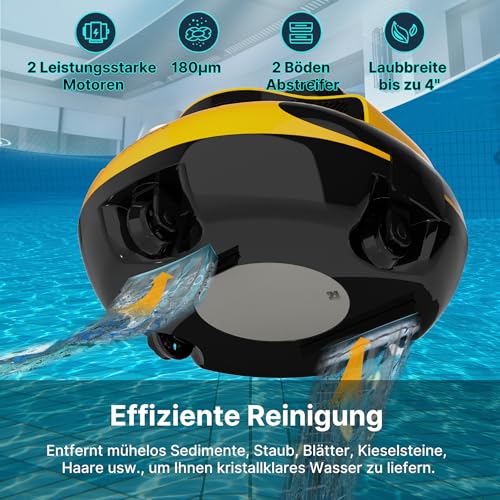 EFFIZIENTE REINIGUNG: Schalten Sie den Roboter ein, tauchen Sie ihn in den Pool und er startet automatisch. Poolsauger bodensauger mit zwei starken Motoren, hochwertigen Rakeln und einer 4-Zoll-Saugöffnung entfernt der Reiniger effektiv Schmutz und lässt Ihren Pool wie neu aussehen. Kabellos poolroboter akku, die Abdeckung lässt sich leicht öffnen und der Filter kann einfach mit Wasser gespült werden.
