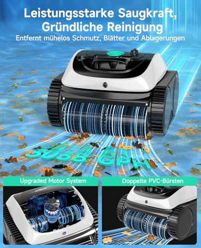 【Leistungsstarke Saugkraft】Ausgestattet mit einem verbesserten unabhängigen Wasserpumpenmotor kann die maximale Filterrate 2642 GPH erreichen. Mit der Dual-PVC-Bürste des Poolroboters können alle Arten von Schmutz, Sand, Blättern und anderen Ablagerungen sowie hartnäckiger Schmutz effizient von allen Oberflächen des Schwimmbeckens entfernt werden.