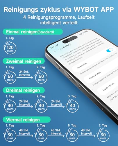 【4 wählbare Reinigungszyklen!】Jetzt können Sie zwischen 2, 3 oder 7 Tagen wählen, um Reinigungsbedürfnisse bis zu 7 Tagen zu erfüllen (Lassen Sie den Poolroboter im Pool). Alternativ steht auch eine einmalige Standardreinigung zur Verfügung, um den Pool zu erfrischen. Diese verschiedenen Modi bieten Ihnen die Flexibilität, je nach Bedarf auszuwählen und optimale Reinigungsergebnisse zu erzielen.