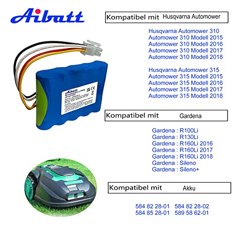 【Voll kompatibler Ersatz-akku für Husqvarna Automower】Dieser Akku ist voll kompatibel mit Husqvarna Automower 310(2015,2016,2017,2018) und 315 (2015,2016,2017,2018) Mähroboter, voll kompatibel mit Gardena Sileno Sileno+ R100Li, R130Li, R160Li 2016, R160Li 2017, R160Li 2018 Rasenroboter. Hinweis: Achten Sie vor dem Kauf darauf, dass Akkugröße, Stecker und Spannung zu Ihrer Maschine passen.