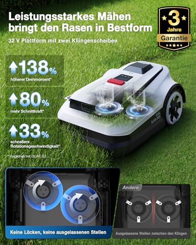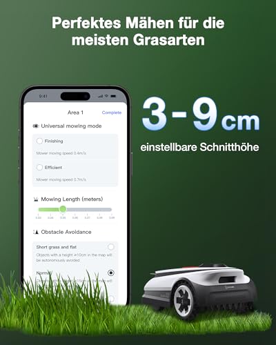 32V Motor sorgt für schnelles, leistungsstarkes Schneiden: Die 32V Akku-Platform verleiht dem Roboter eine außergewöhnliche Schnittleistung und Mähgeschwindigkeit. Dank der 2 Messerscheiben besitzt er eine Schnittbreite von insgesamt 330 mm und bewältigt bis zu 400 m² pro Stunde bei einer Geschwindigkeit von bis zu 0,7 m/s . Die Schnitthöhe ist von 3 cm bis 9 cm elektrisch per APP einstellbar, damit passt er sich problemlos verschiedenen Grasarten an und sorgt bei jedem Durchgang für einen perfekt gepflegten Rasen.