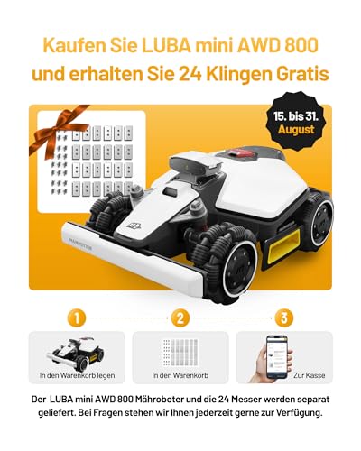 Rasenpflege rund um die Uhr, hohe Mähleistung: Die 6 rasiermesserscharfen Klingen des Rasenmäherroboters LUBA mini AWD bieten eine hohe Mähleistung. Die Lithiumbatterie von LUBA hat ausreichend Kapazität für 180 Minuten Dauerbetrieb und die Fähigkeit, bis zu 324 m²/h zu mähen. Darüber hinaus verfügt der LUBA mini AWD über einen Geräuschpegel von 60 dB, ist IPX6-wasserdicht, hat Regenerkennung, FOTA-Update, Anwendungsbenachrichtigung, GPS-Tracking, Eigentümerauthentifizierung, Geo-Fence-Alarm, Airtag-Kompatibilität und andere Funktionen