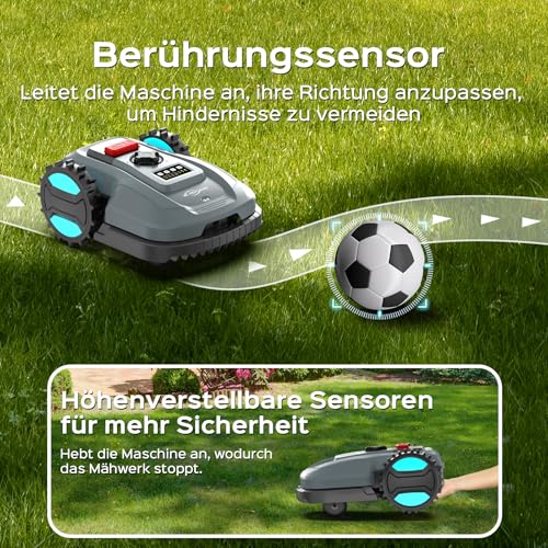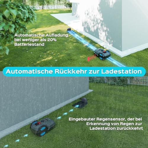 Integrierter Regensensor und bequeme Steuerung via App:Der Lawn Mower Robot ist mit einem praktischen Regensensor ausgestattet, der das Mähen automatisch stoppt, wenn es regnet, um den Rasen zu schützen. Mit der App können Sie ganz bequem Mähzeiten planen