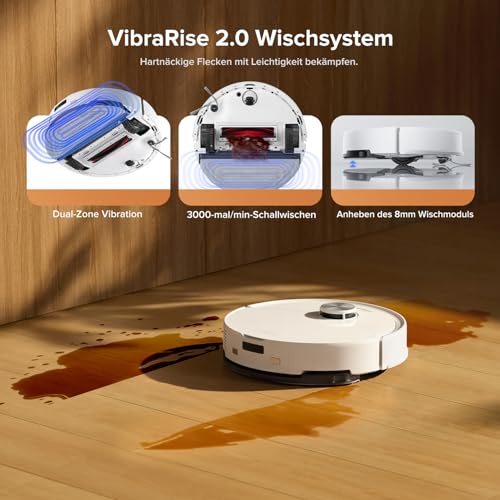 VibraRise 2.0 Wischsystem: Erleben Sie die Kraft der Zwei-Zonen-Schallvibrationstechnologie, die bis zu 3000 Mal pro Minute schrubbt, um alle Flecken und Verschmutzungen zu entfernen und Ihre Böden makellos zu hinterlassen. Es hebt bis zu 8 mm auf Teppichen für nahtlose Übergänge.