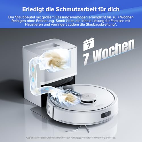 7 Wochen ohne manuelle Eingriffe: Genieße sorgenfreie Reinigung mit der selbstentleerenden Dockingstation und einem großen Staubbeutel mit 2,7 l – der bis zu 7 Wochen lang nicht entleert werden muss. Ideal für vielbeschäftigte Familien und Haustierbesitzer. Außerdem hilft dir das smarte Laden außerhalb der Spitzenzeiten beim Energiesparen und hält deinen Roboter stets einsatzbereit.