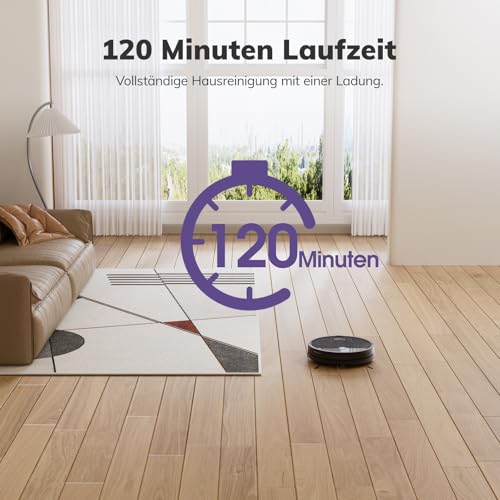 【120min Laufzeit & Automatisches Aufladen】Der E3 Roboter reinigt bis zu 120 Minuten pro Ladung und kehrt automatisch zur Ladestation zurück bei niedrigem Akkustand.