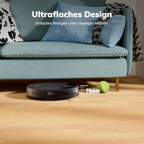 【Ultraflaches Design】Das 7.6cm schlanke Design ermöglicht dem E3 Staubsauger Roboter die einfache Reinigung unter Betten, Sofas und anderen Möbeln.